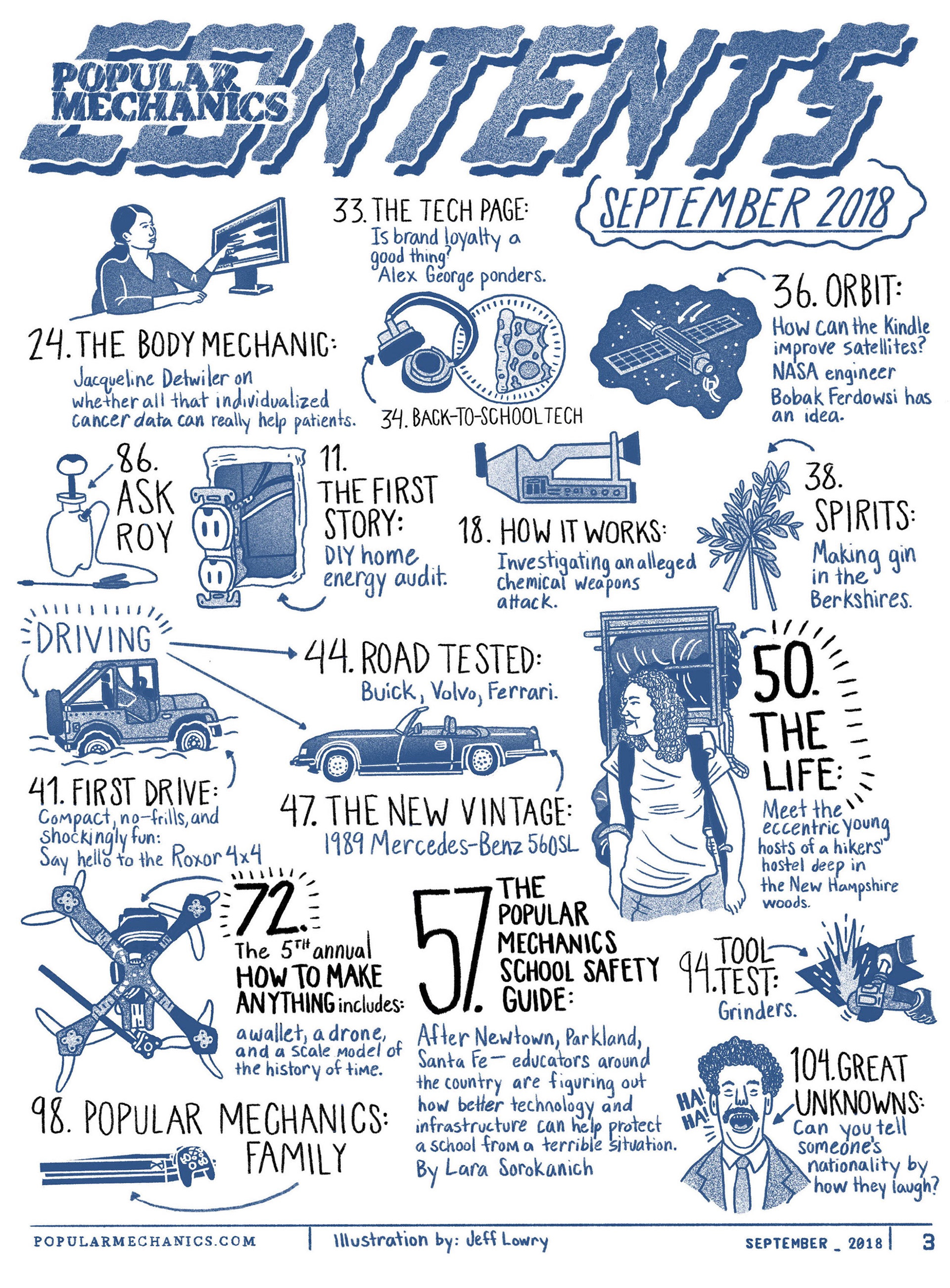 Illustrated tables of contents, spot illustrations & handlettering for the “How to Make Anything” issue of Popular Mechanics.